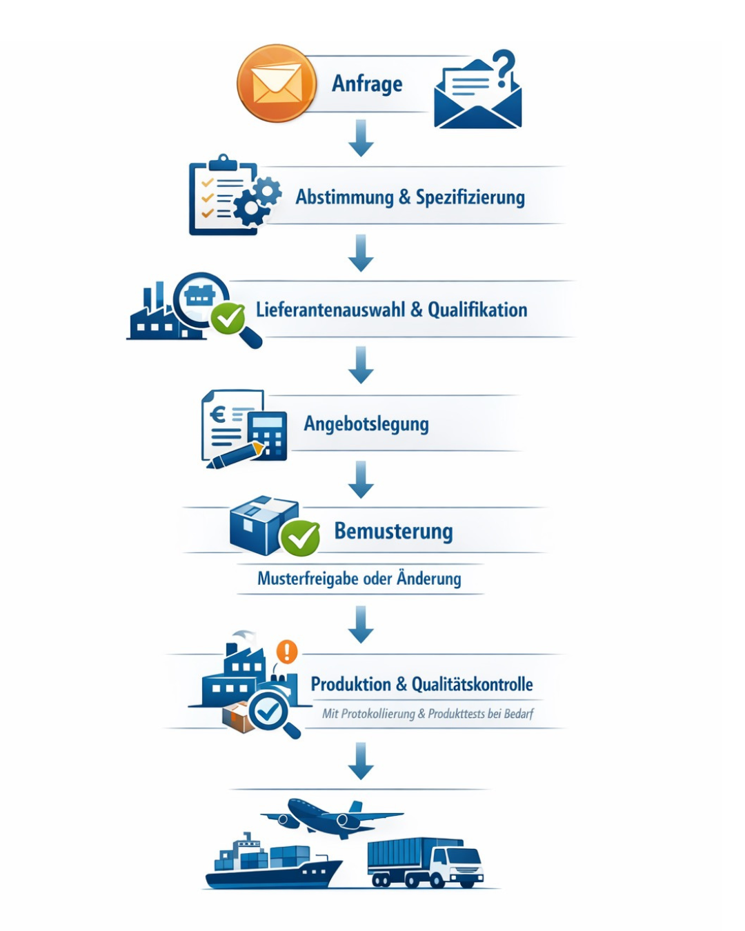 Wir hinterfragen, optimieren und begleiten jeden einzelnen Schritt – von der ersten Anfrage bis zur finalen Lieferung. Dabei klären wir oft schon im Vorfeld Themen, die später entscheidend sind: Materialien, Produktionsmöglichkeiten, Zertifizierungen, Qualitätssicherung und vieles mehr.